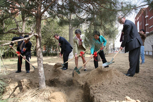 签字仪式后,与会人员在签字仪式背景墙上签字留念。双方领导在国际学院楼前共同栽下了象征着两校友谊的中英友谊树。