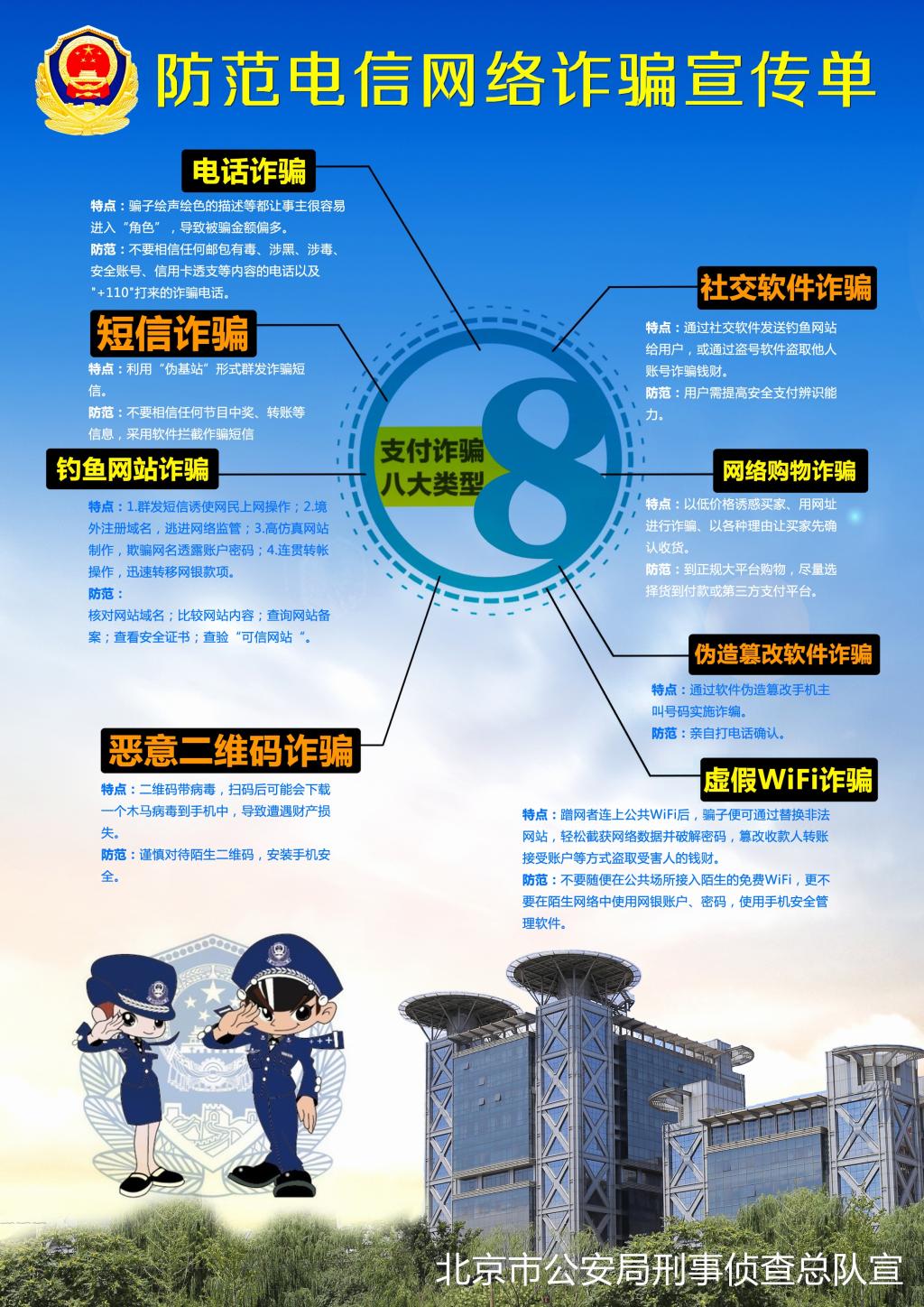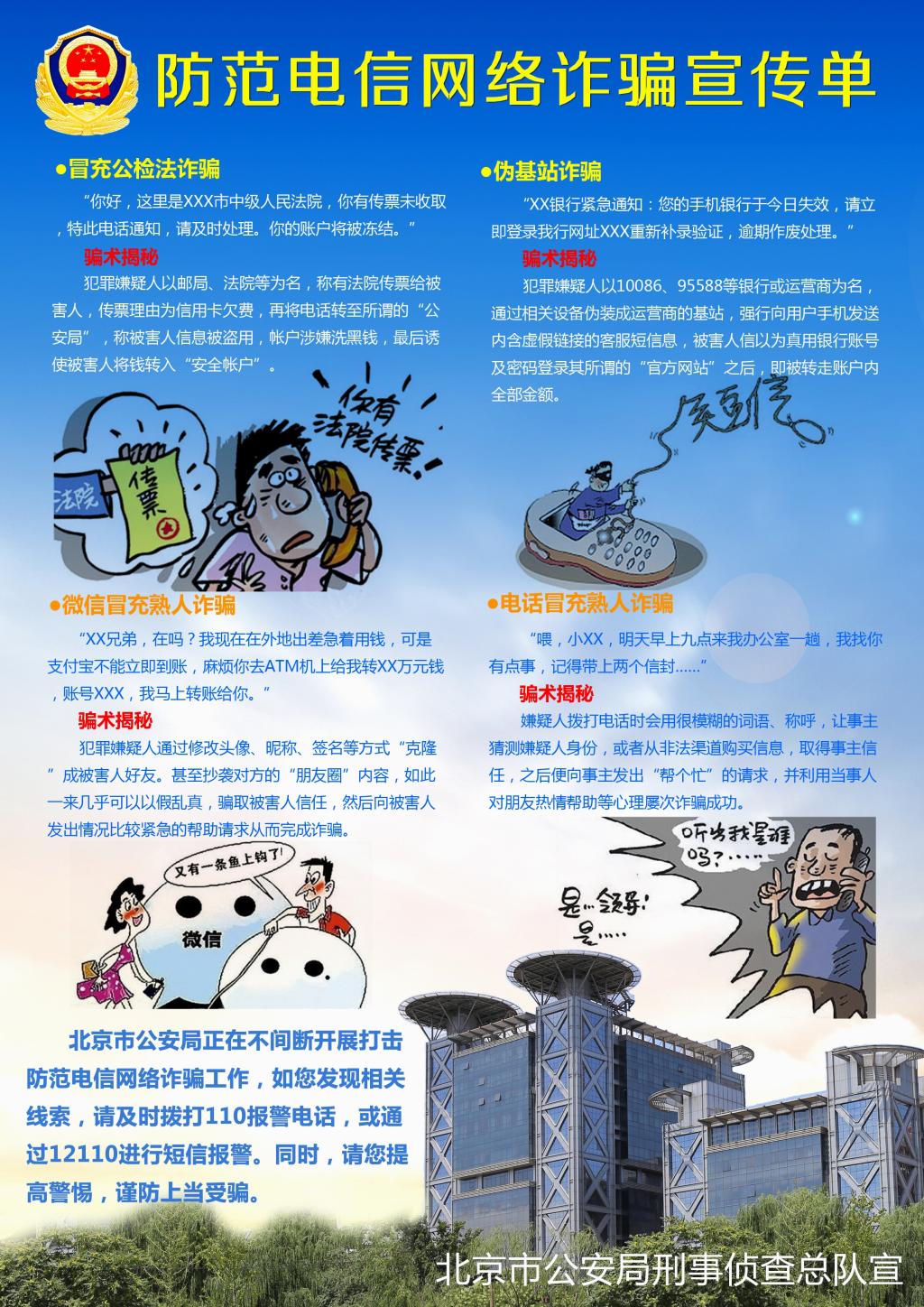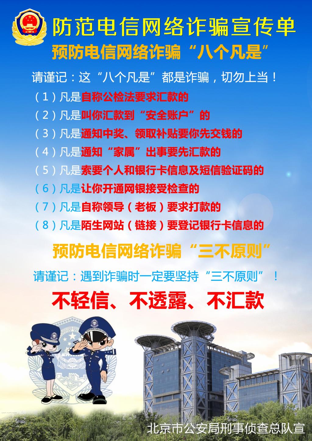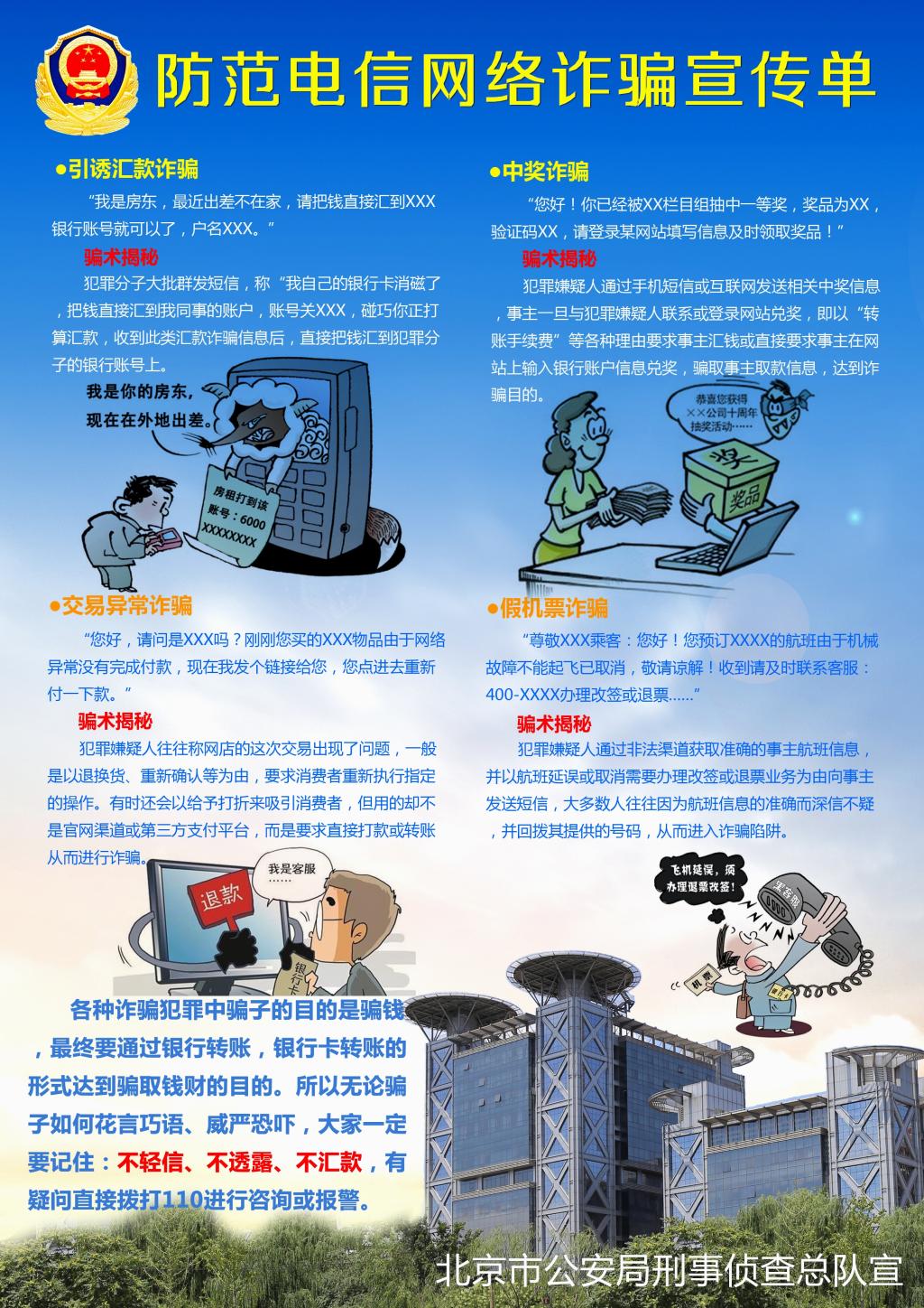 近年来,电信网络诈骗案件持续高发。尤其针对学生、家长被电信诈骗案件时有发生,为确保家长、师生免受损失,北京市公安局针对平时工作中掌握的各类犯罪特点和规律,特别提示大家做好以下防范: