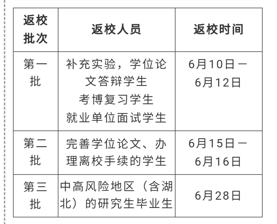 一、各批次研究生毕业生返校时间如下表,一定要接到通知才能返校哦!