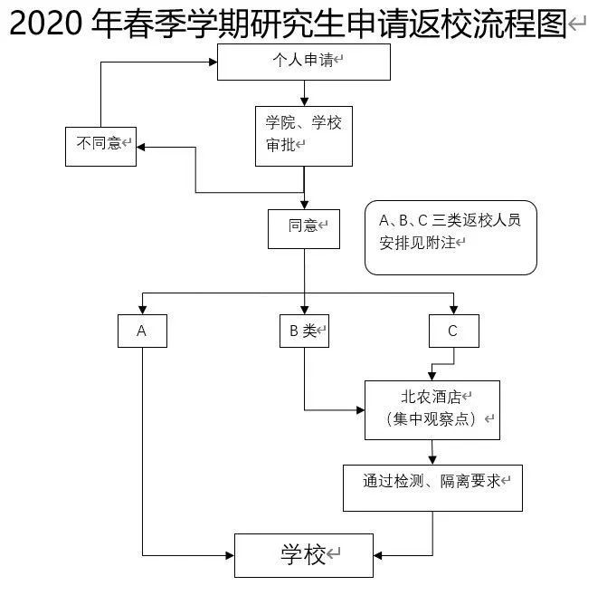 C类返校人员:中高风险地区(含湖北)返京的研究生,持返校申请审核批准截图、核酸检测阴性结果证明、健康“绿码”、本人身份证件(校园一卡通、学生证或身份证),在北农酒店入口经测温合格、验证后入住,集中隔离观察14天。隔离期满进行第二次核酸检测,检测结果为阴性的,按入校流程入住宿舍。
