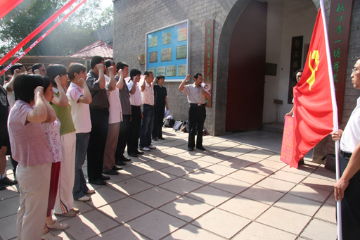 在白洋淀雁翎队纪念馆前,全体党员面对鲜红的党旗宣誓。经贸系教师张子睿、生物系总支书记关雪莲、财务处干部俞涛分别代表新教工党员、老党员和积极分子发言,组织部部长张铁强发表讲话,他希望各级党组织及党员充分发挥先进模范作用,强化党组织和党员的服务意识和实践意识,增强党组织的凝聚力和吸引力。宣誓仪式在全体党员高唱国际歌声中结束。