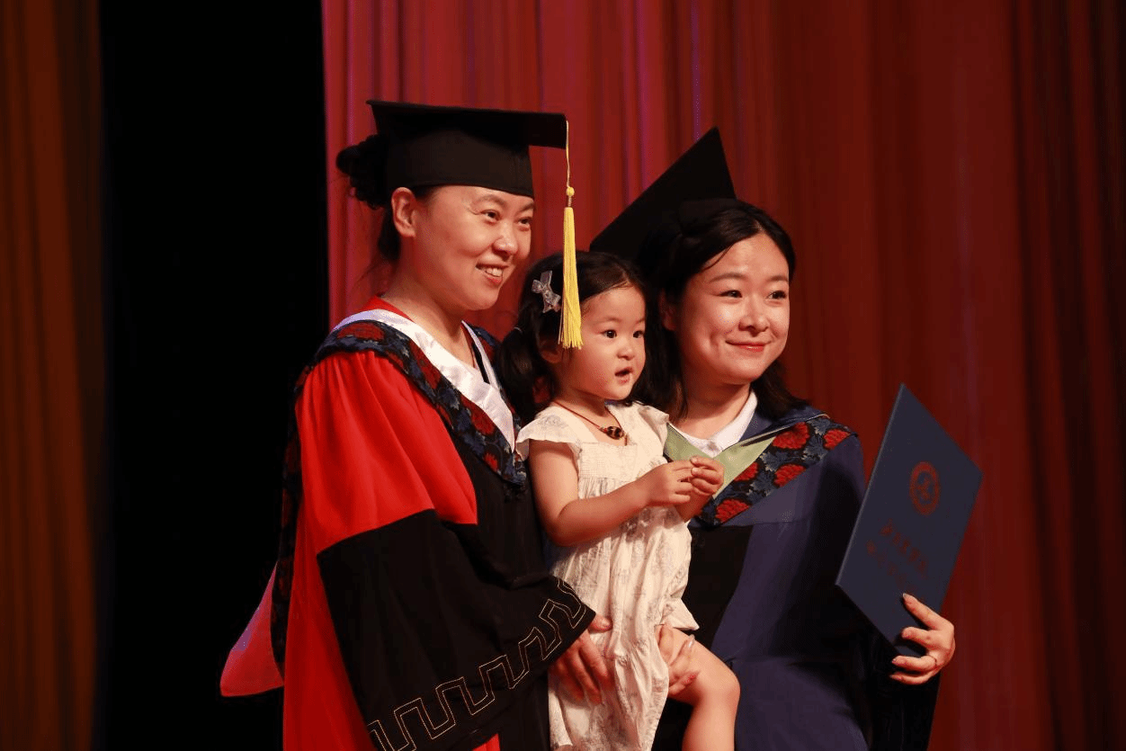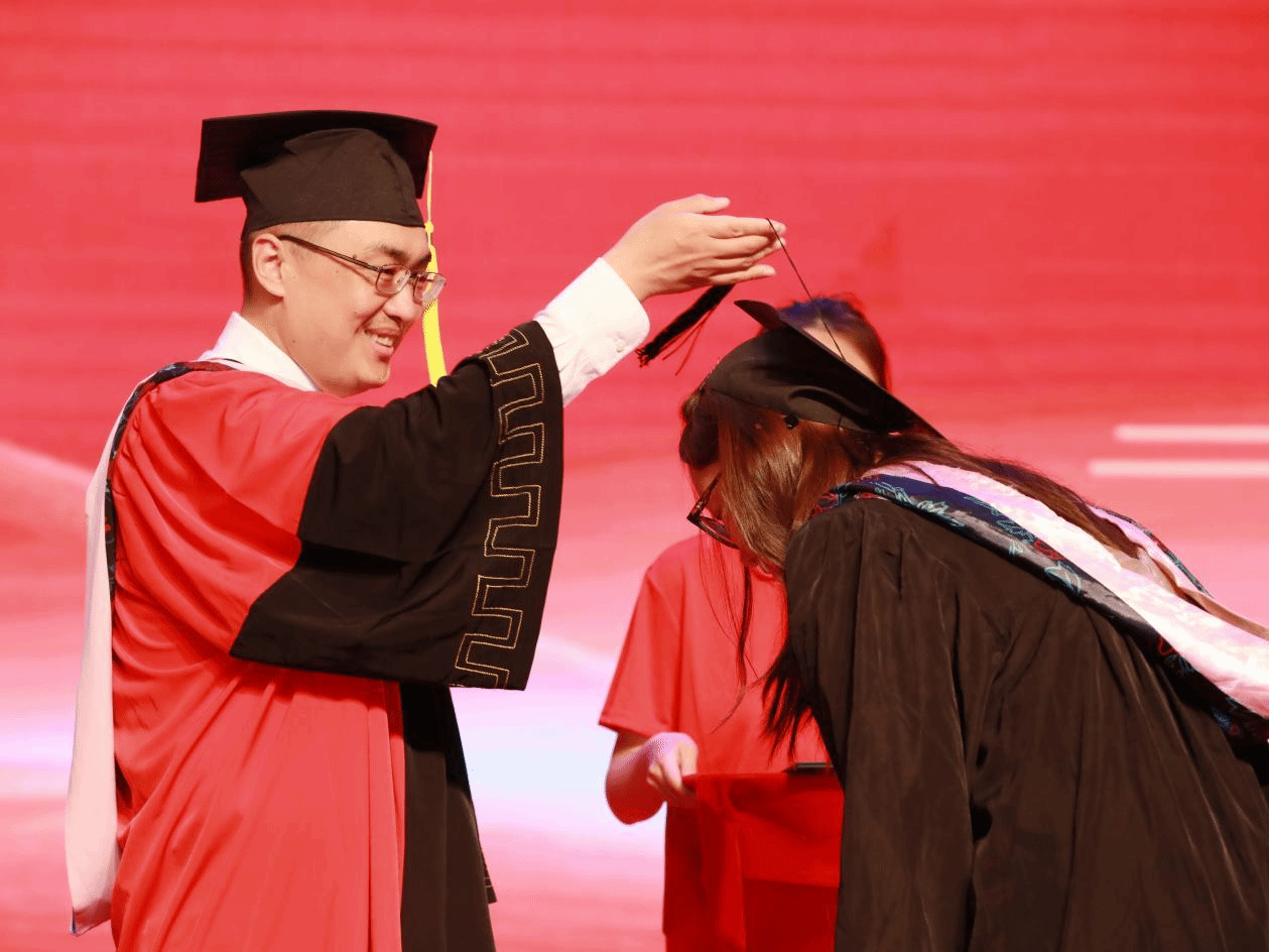 校领导、学院领导及学位委员会委员为全体毕业生一一拨正流苏。学校专门为每一位上台受礼的毕业生拍摄学位授予仪式导师合影照,记录珍贵而温情的一刻。
