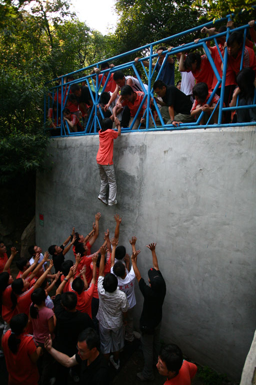 在下午的培训中,同学及老师们参与了惊险刺激的挑战活动,缅甸桥,电网,合力过桥等等。活动中,不光是对自我的挑战,还有加强了学生们的集体荣誉感和培养了团队协作的精神。让学生及老师们提前感受到奥运的激情。学生及老师攀登上团队毕业墙后,意味着素质拓展训练的结束。