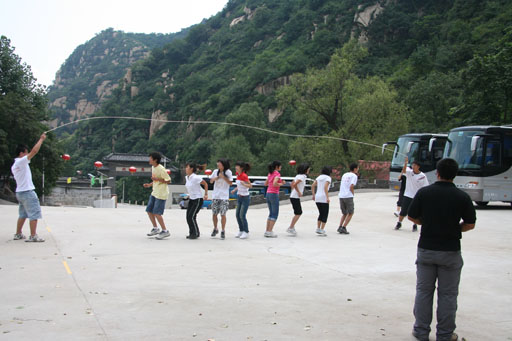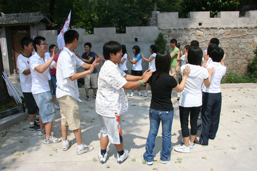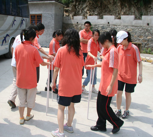 抵达双龙山,感受连绵不断的山脉带来的震撼。老师和学生要在进行挑战与竞争。在培训教练的安排下,永利3044官网唯一志愿者分为三队,分别是朝阳一队,朝阳二队,朝阳三队;学生会代表为一队,组成“团队之星”;由团委书记杨宝东,8位代表各系的老师构成“非常8+1”团队。比赛尚未开始,五支队伍分别选出了队长,秘书,制作队旗及定口号。素质拓展培训活动是各人挑战,更是集体挑战。5队进行有趣的“挑战NO.1”的比赛,“挑战NO.1”分为四个挑战项目,分别为盲人投球,跳绳,不倒森林,激情拍掌。