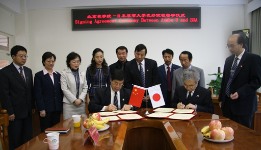 院长王有年、日本麻布大学校长政网俊夫在协议书上签字。