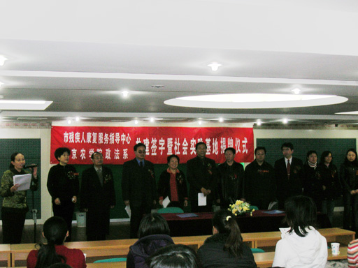 下午,政法系与北京市残疾人康复服务指导中心签定共建校外实践基地合作协议。在合作过程中,政法系将要利用学校的智力资源为康复服务指导中心的残障社会工作、社区康复,特别是残障者服务、心理咨询、法律咨询工作的开展提供必要的服务,并对北京市残疾人联合会展开的京郊农村社区残障社会工作提供力所能及的协助,以此为契机,锻炼师资队伍、提高学生的实践能力;康复服务指导中心协助政法系在所属单位建立社会实践基地,为政法系开展社会实践和实践教学活动提供场所和其他必要条件。