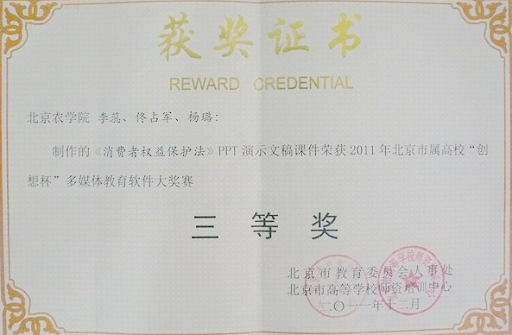 近日,永利3044官网唯一人文社会科学学院李蕊、佟占军、杨璐老师制作的《消费者权益保护法》PPT课件获北京市属高校“创想杯”多媒体教育软件大奖赛三等奖。