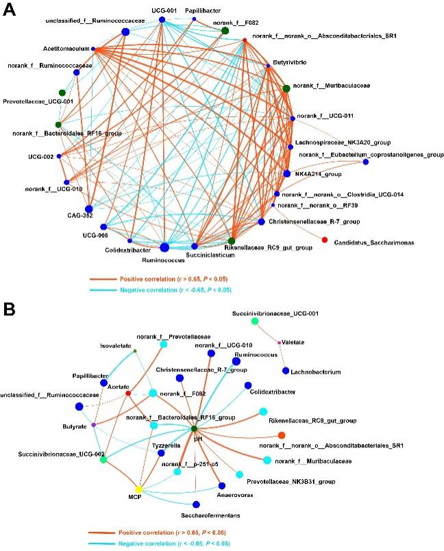 图2.附着细菌与瘤胃发酵参数的相关性网络分析