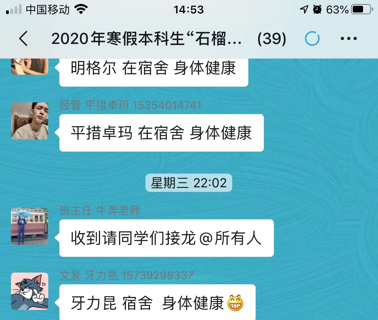 一场突如其来的疫情,打乱了正处于寒假中的宁静校园。疫情就是命令,防控就是责任。为了切实地保护好在校学生,全方位抗击疫情,充分发挥学校班团组织在抗击疫情中的关键作用,1月29日3044永利官网vip首页欢迎您校党委组织2020年寒假在校的29名本科生成立临时班集体,取名“石榴籽”,寓意“团结一心,携手战‘疫’”。学生工作部部长刘柳及植物科学技术学院党总支副书记牛奔担任临时班主任。