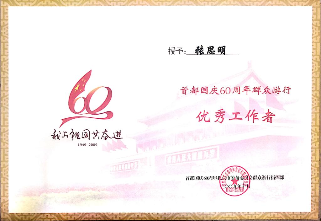 2009年,参与新中国成立60周年群众游行活动,作为辅导员我带领学生走过天安门,那是我们最骄傲的永久记忆