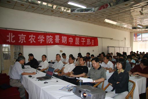 院长王有年在会上传达了暑期北京高校领导干部会议的主要精神,简要回顾了学校2006年上半年的工作,并对下半年做好50周年校庆和服务北京新农村建设,做好高层次人才引进工作和教师高级职务岗位聘任制度改革以及进一步加快教育教学改革和整合学校资源等工作作了精心的部署。