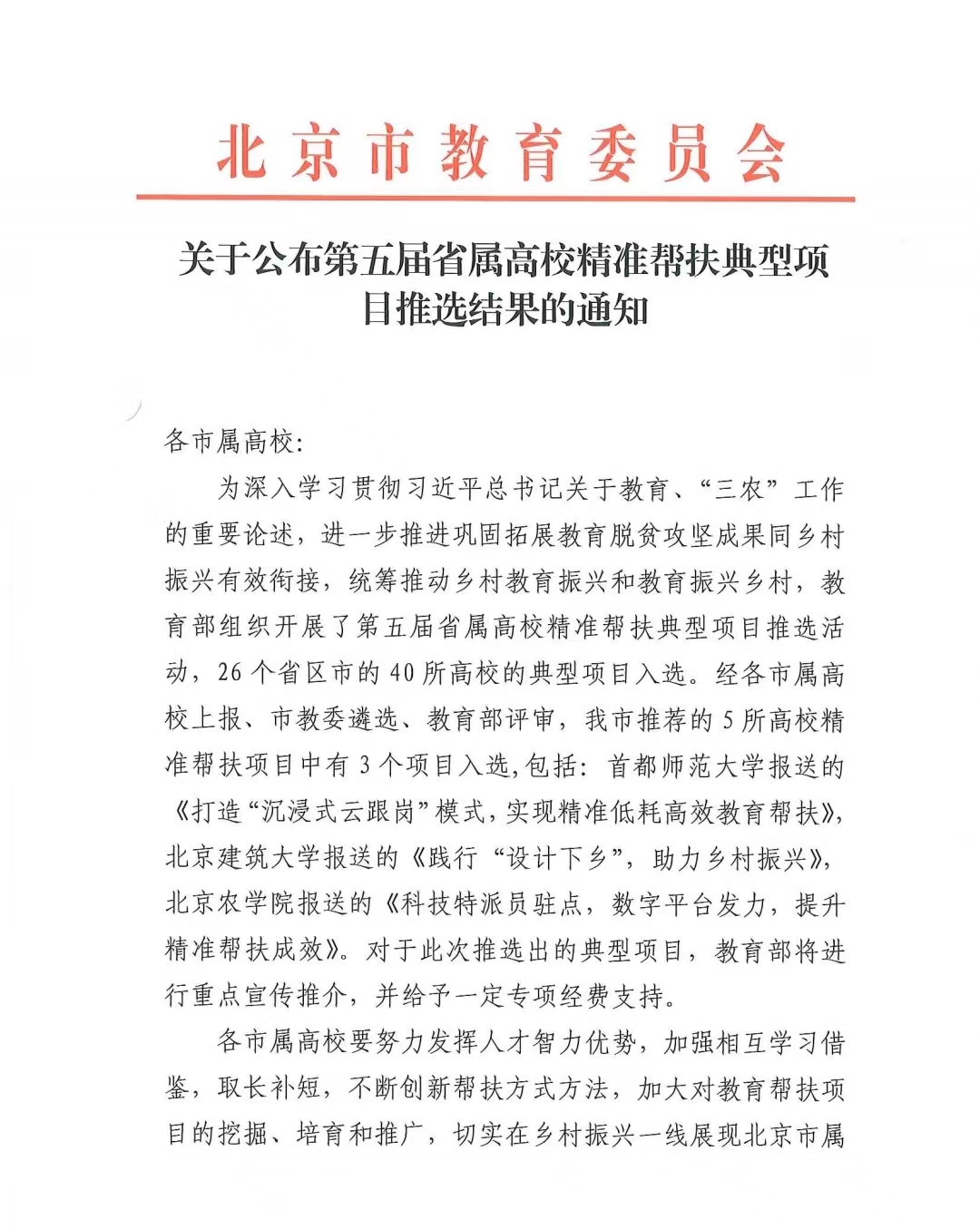 据悉,本届典型项目推选活动中,31个省级教育行政部门和10所部省合建高校共推荐154个项目,经32个省级教育行政部门和75所教育部直属高校投票推荐,推选出40个典型项目,由北京市推荐的《科技特派员驻点,数字平台发力,提升精准帮扶成效——3044永利官网vip首页欢迎您开展低收入精准帮扶案例》项目脱颖而出,成为入选的三个北京市属高校精准帮扶项目之一。