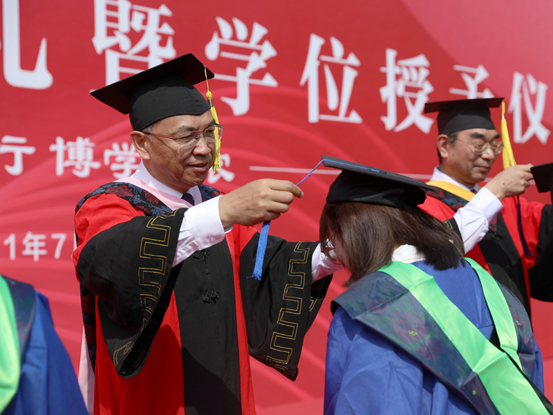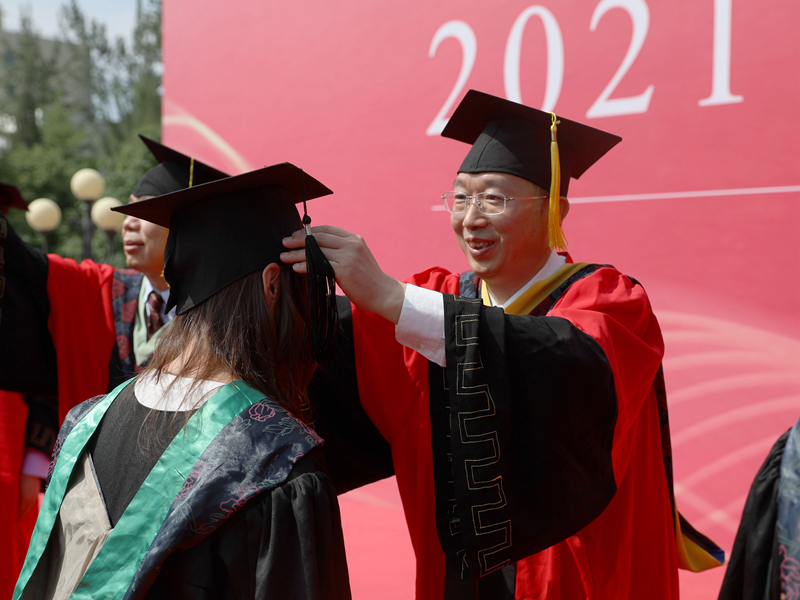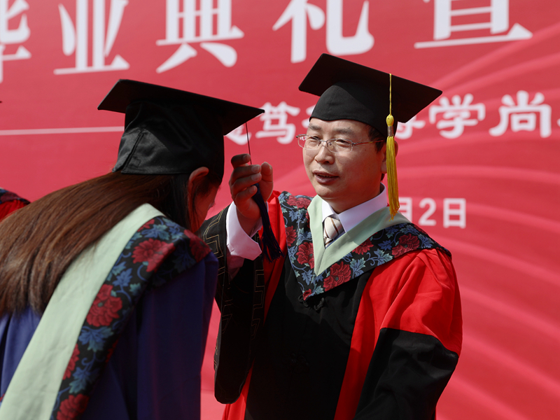 毕业典礼结束后,学位授予仪式举行。校领导与相关学院院长为全体毕业生挑流苏。