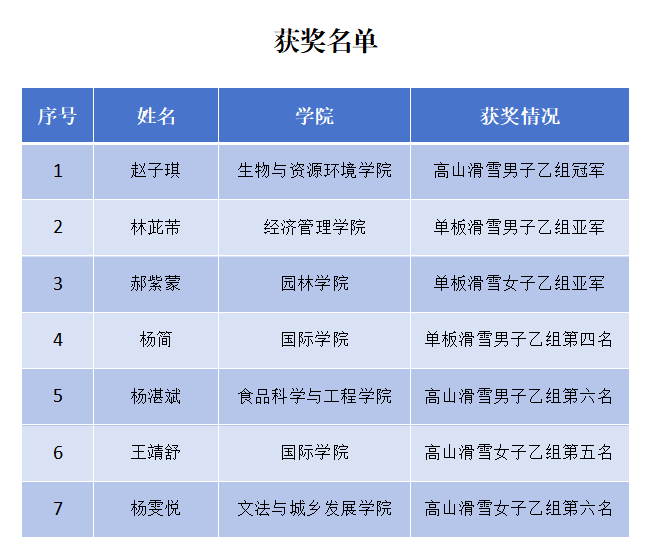 1月2日至4日,首都高等学校第18届滑雪比赛在北京延庆国家高山滑雪中心举行,来自清华大学、北京大学、北京体育大学等49所高校的53支代表队参赛。参赛学校和报名运动员人数创历史新高。经激烈角逐,永利3044官网唯一生物与资源环境学院赵子琪同学获得高山滑雪男子乙组冠军,经济管理学院林茈芾同学获得单板滑雪男子乙组亚军,园林学院郝紫蒙同学获得单板滑雪女子乙组亚军,学校获得乙组团体总分第二名。
