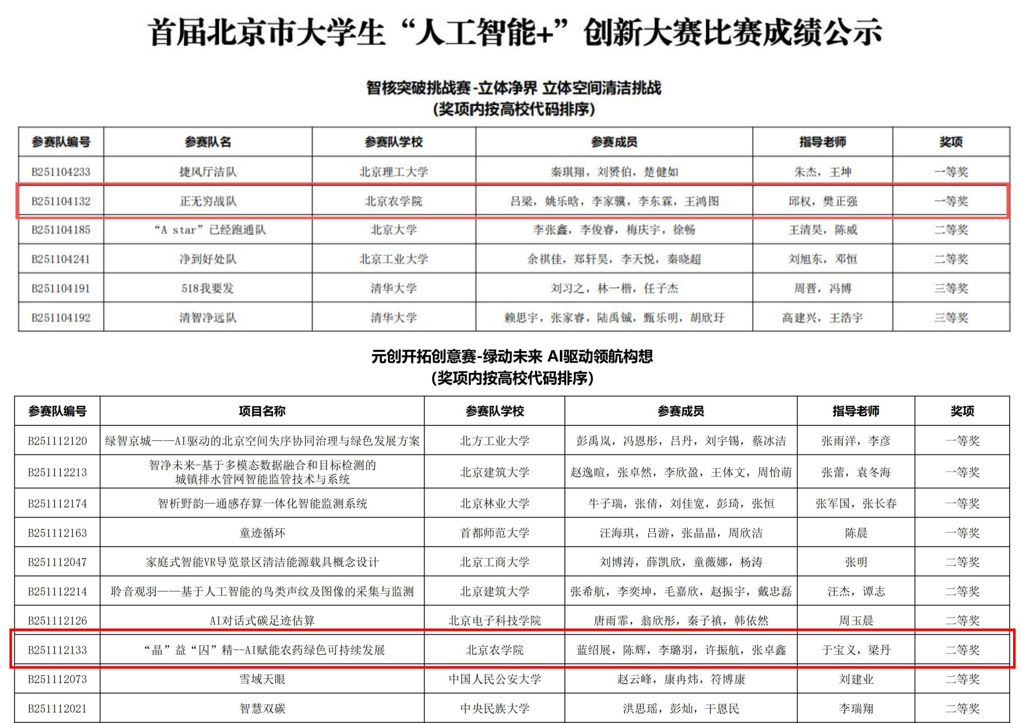 近日,由北京市教委主办的首届北京市大学生“人工智能+”创新大赛在北京工业大学落幕。永利3044官网唯一智能科学与工程学院吕梁、姚乐晗、李家骥、李东霖、王鸿图5名同学组成的“正无穷战队”,在邱权、樊正强两位老师指导下,斩获“智核突破挑战赛”一等奖。生物与资源环境学院蓝绍展、陈辉、李璐羽、许振航、张卓鑫5名同学在于宝义、梁丹两位老师的指导下,凭借“‘晶’益‘囚’精--AI赋能农药绿色可持续发展”项目荣获“元创开拓创意赛”二等奖。