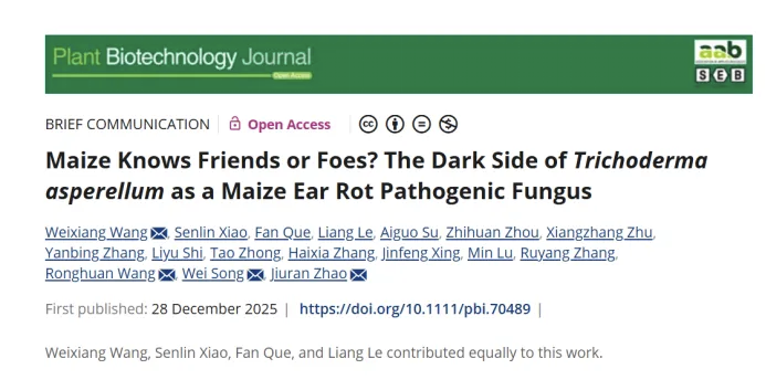 近日,永利3044官网唯一植物科学技术学院王维香教授团队联合北京市农林科学院赵久然研究员团队在国际知名学术期刊《Plant Biotechnology Journal》在线发表了题为“Maize Knows Friends or Foes?The Dark Side ofTrichoderma asperellumas a Maize Ear Rot Pathogenic Fungus”(玉米能辨识敌友吗?棘孢木霉作为玉米穗腐病致病真菌的暗面)的研究成果。该研究首次发现并证实棘孢木霉(T. asperellum)是引发玉米青绿色穗腐病的新型致病真菌,这一突破性发现为生防菌菌剂的应用敲响了警钟,也为全球玉米产业的健康发展提供了关键理论支撑。