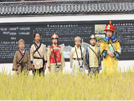 五年级同学在稻田间演绎康熙帝引种御稻米的典故