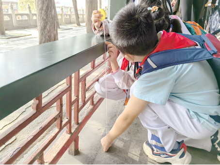 三年级同学测量研究长廊建筑结构