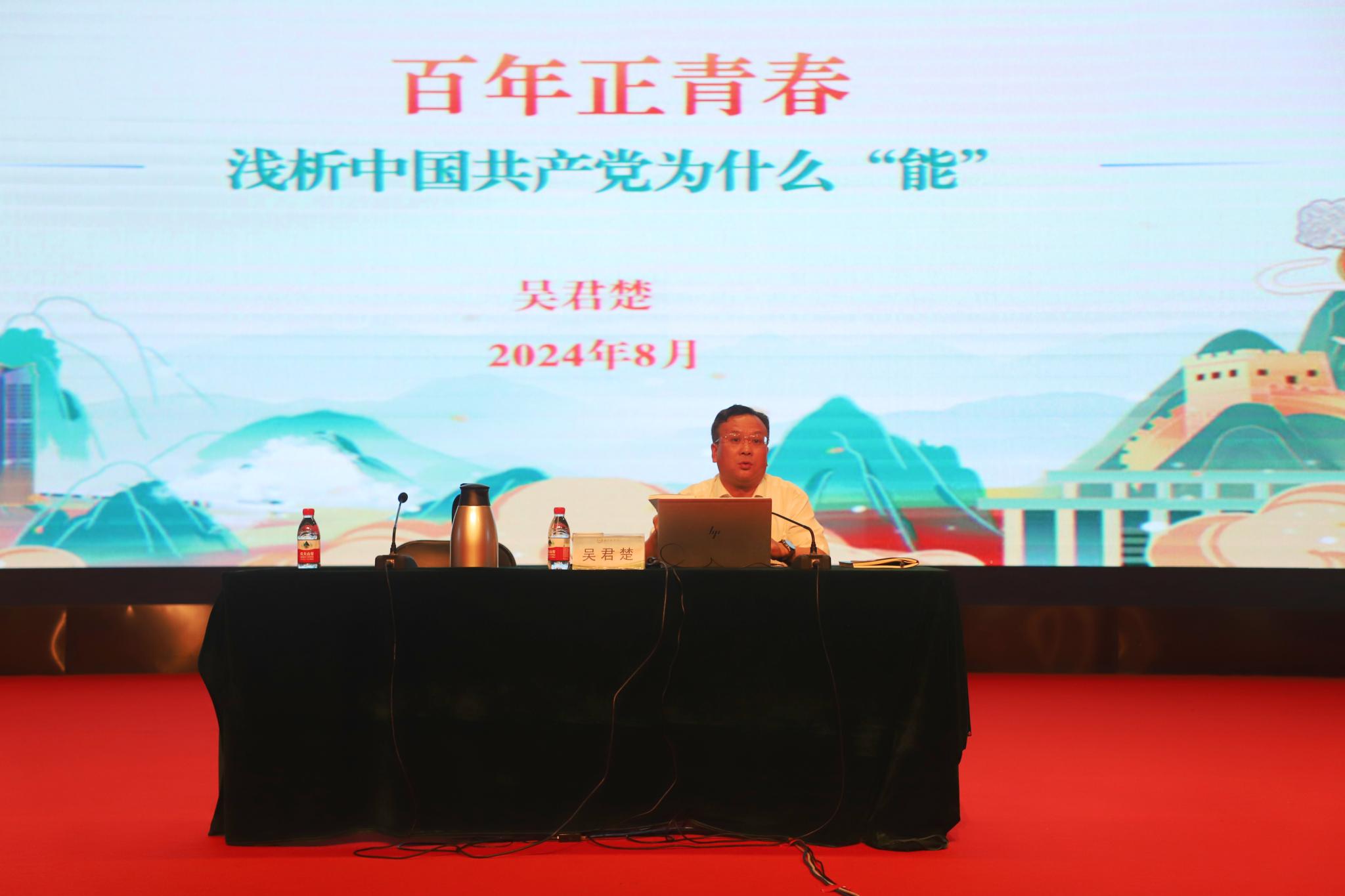 为深入学习贯彻党的二十大和二十届二中、三中全会精神,深入实施青年马克思主义者培养工程,着力提高新时代新征程团干部教育培训工作科学化、制度化、规范化水平,培养忠诚干净担当的高素质团干部队伍,推动学校共青团工作高质量发展,近日,学校第八期青年马克思主义者培养工程暨团学骨干训练营开营。党委常委、纪委书记、二级高级监察官吴君楚出席开营仪式,并作题为“浅析中国共产党为什么‘能’”的专题讲座。