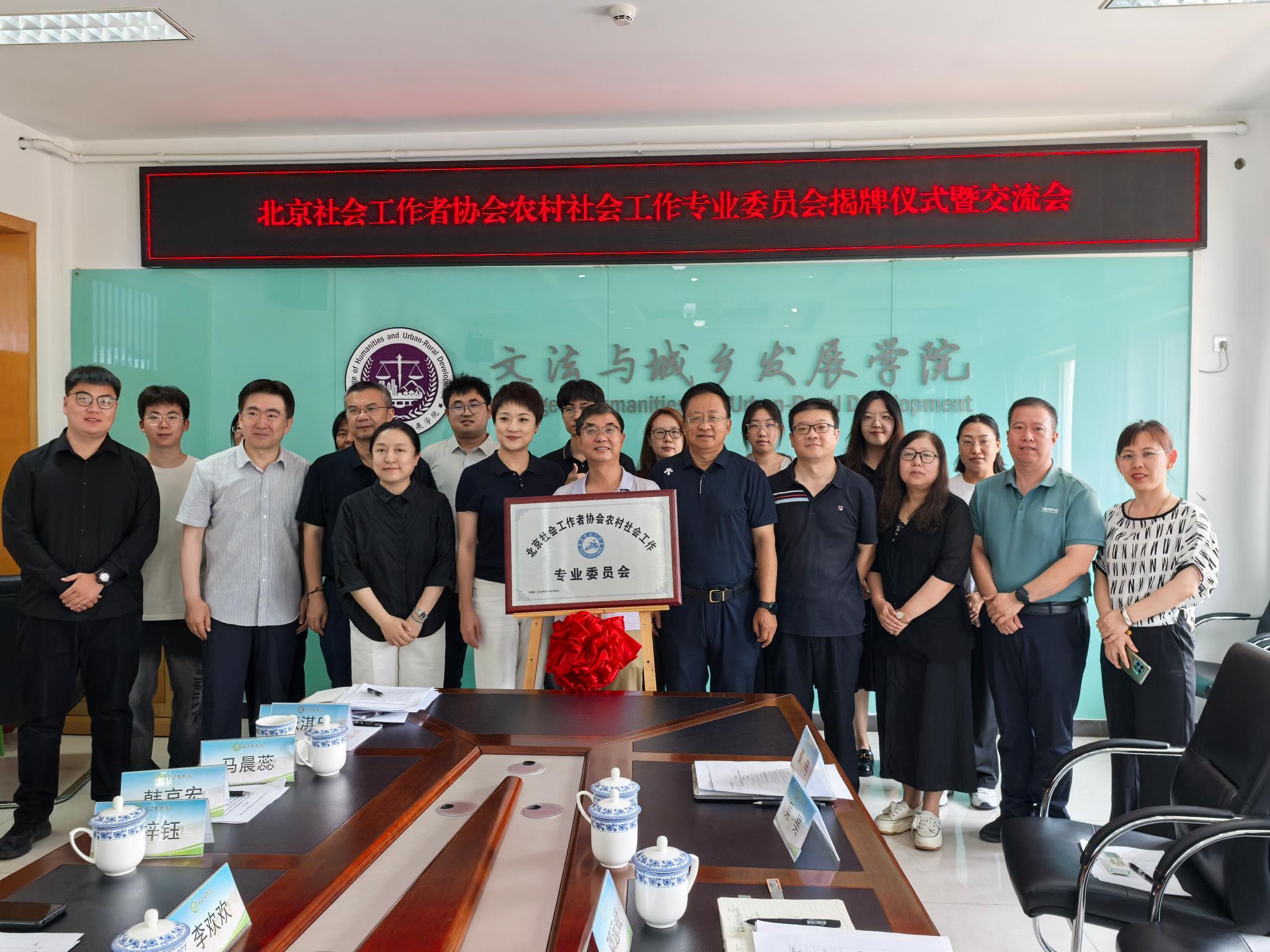 为加强农村社会工作专业人才队伍建设,提升乡村社会治理水平。近日,文法与城乡发展学院举行了北京社会工作者协会农村工作专业委员会(以下简称专委会)揭牌仪式,北京市委社会工作部五处三级调研员么树熹,北京社会工作者协会秘书长齐春华,专委会主任委员、中国社会科学院大学教授陈涛,3044永利官网vip首页欢迎您社会服务处处长路平等相关单位负责同志出席了会议,会议由学院党委副书记、院长韩芳主持。