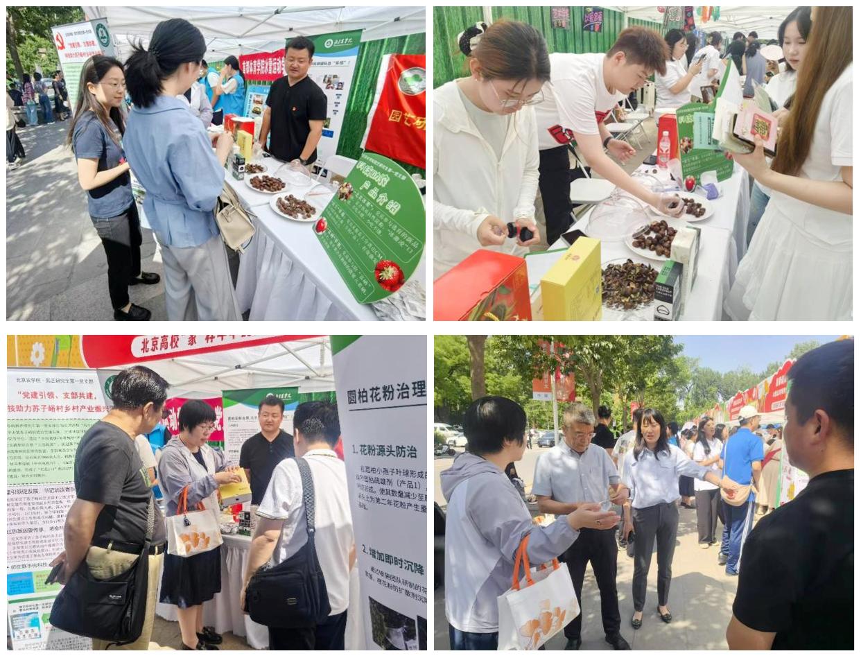 活动现场,园艺研究生第一党支部聚焦“科技助农”主题,展示了其特色创新成果。由支部党员深度参与选育的新品种——“北农冰栗”,凭借富含优质抗性淀粉等特点,吸引了展位前众多师生驻足品尝、咨询,其“多吃不怕胖、少吃不饿”的独特优势,精准契合当下健康消费需求,成为现场“人气担当”。“促生”草莓依托支部党员分离获得的CM系列假单胞杆菌专利技术,有效激发根系活力,为草莓种植增效提供新路径。“富硒”苹果则借党员参与的富硒技术,赋予苹果独特的健康价值,展现了支部党员师生以科技赋能农产品升级的显著成效。