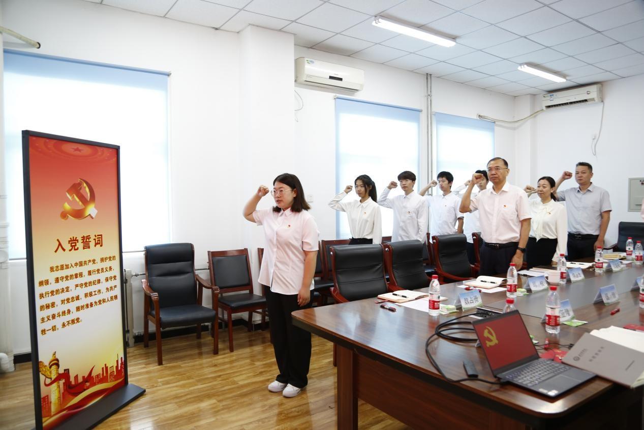 大家集体观看了本科生第二党支部党纪学习教育宣誓视频。仲丛生为新发展党员佩戴党徽、颁发党章,为学生党员颁发“政治生日”卡。新发展党员面对党旗庄严宣誓,老党员重温了入党誓词。