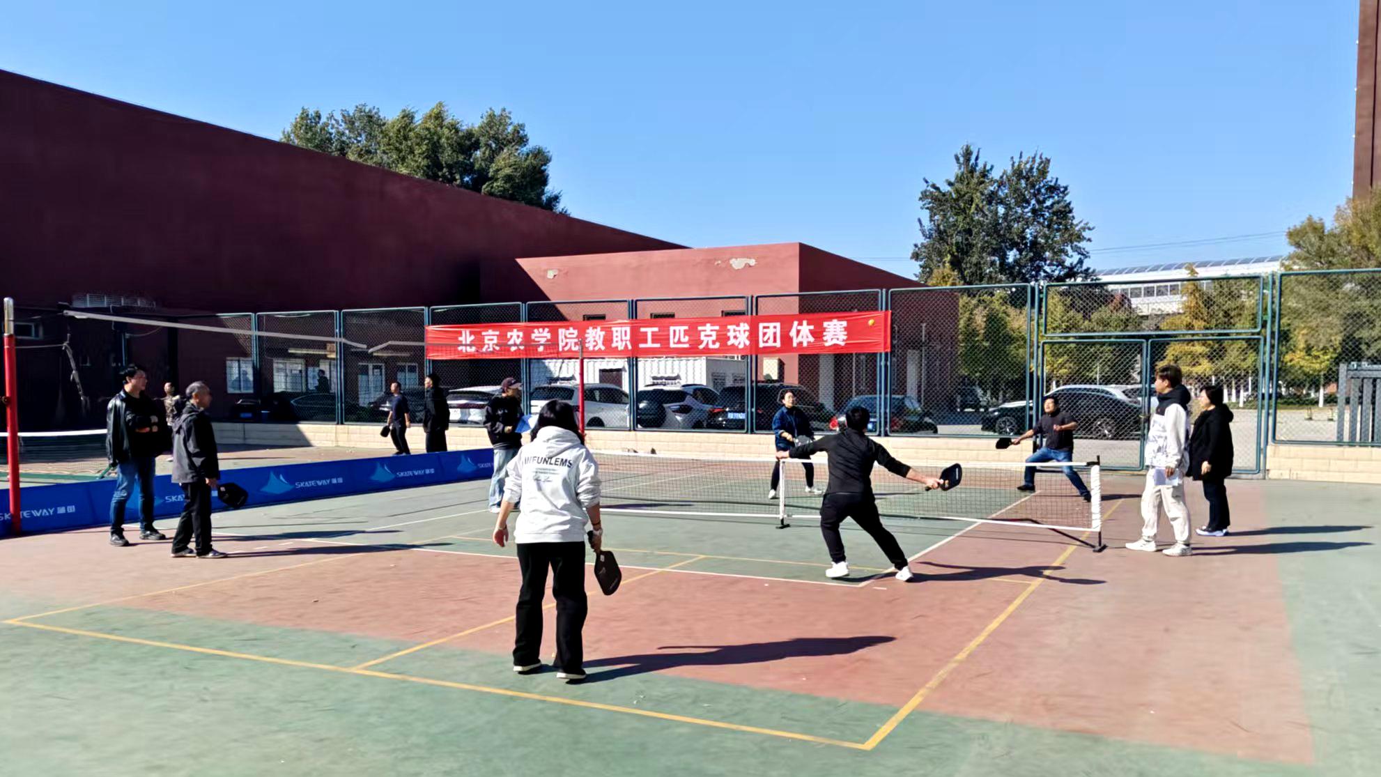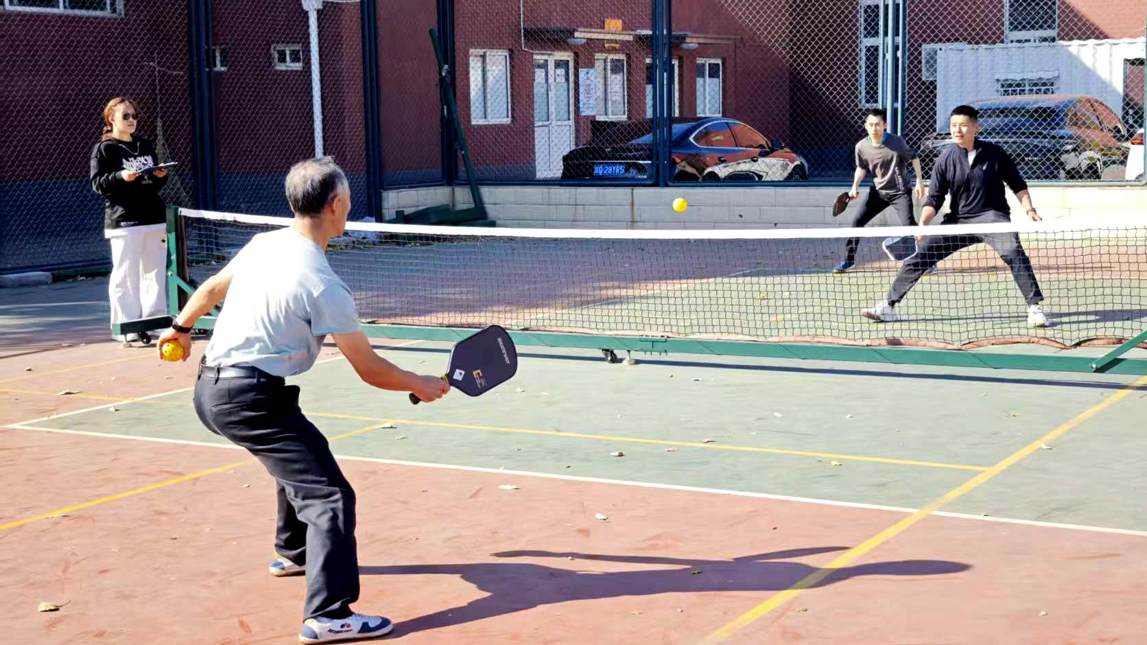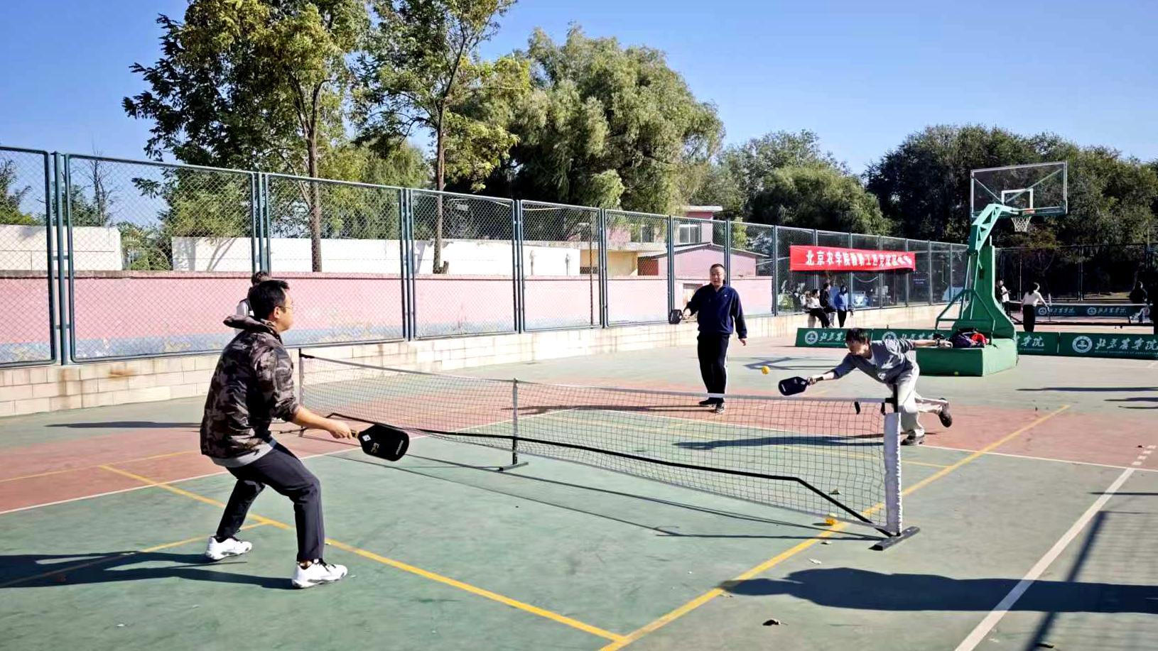 匹克球是一项融合网球、羽毛球与乒乓球特点的新兴球类运动,上手门槛低,规则简单易懂;场地要求灵活,成本亲民;运动强度适中,对抗性与趣味性兼具,因而适合各类人群参与。作为全民健身体育项目,学校对匹克球运动给予高度重视。学校专门划拨场地设置匹克球场地,配备专业球拍、球网等器材,组织匹克球培训,邀请专业教练指导,搭建起“日常练习+专项培训+竞技比拼”的全链条参与平台,为运动普及提供了坚实保障。