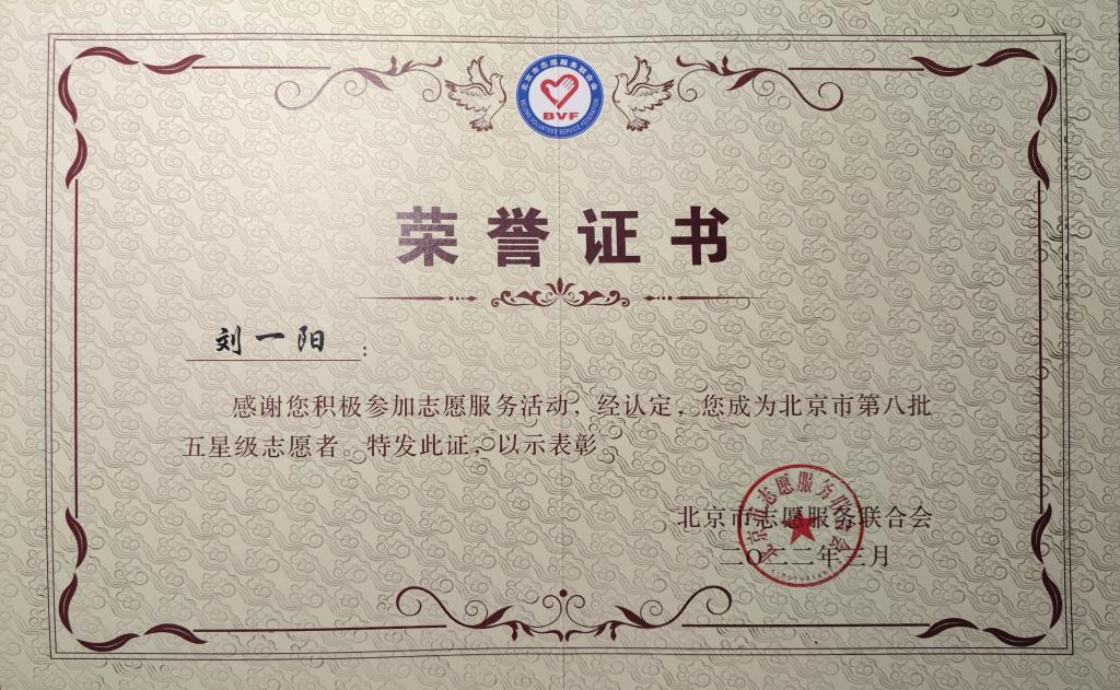 2020年以来,刘一阳每逢寒暑假就会加入北臧村镇疫情防控志愿者工作,从疫情初期的“哪有需求往哪儿去”,到如今有序开展疫情防控工作,都能看到刘一阳支援一线的身影。他长期参加抗击新冠疫情的志愿服务活动,累计志愿时长2674小时。先后获得区级五星志愿者、北京市五星志愿者称号。先进事迹被北京青年报等媒体报道。