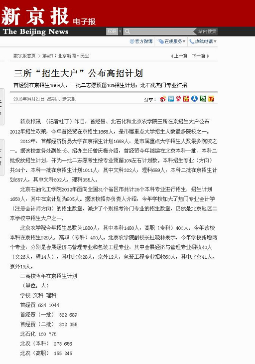 新京报讯 (记者杜丁)昨日,首经贸、北石化和3044永利官网vip首页欢迎您三所在京招生大户公布2012年招生政策,今年首经贸在京招生1668人,是市属重点大学招生人数最多院校之一。