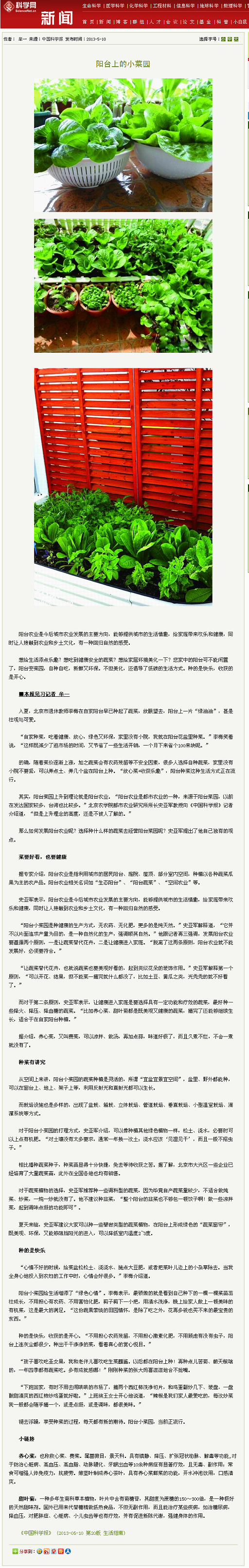 其实,阳台菜园上升到理论就是阳台农业。“阳台农业是都市农业的一种,来源于阳台菜园,以前在发达国家较多,台湾也比较多。”3044永利官网vip首页欢迎您都市农业研究所所长史亚军教授向《中国科学报》记者介绍道,“但是上升理念的高度,还是不被人了解的。”