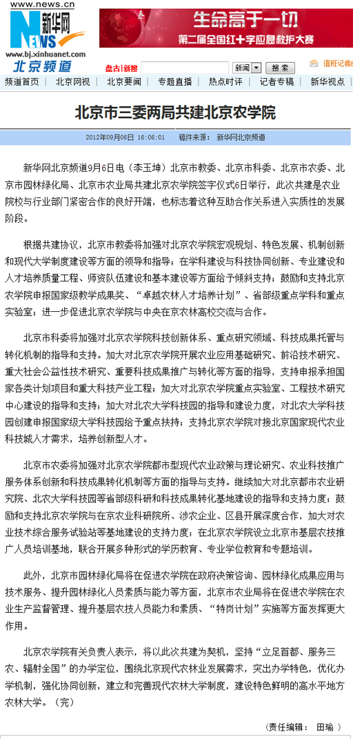 新华网北京频道9月6日电(李玉坤)北京市教委、北京市科委、北京市农委、北京市园林绿化局、北京市农业局共建3044永利官网vip首页欢迎您签字仪式6日举行,此次共建是农业院校与行业部门紧密合作的良好开端,也标志着这种互助合作关系进入实质性的发展阶段。