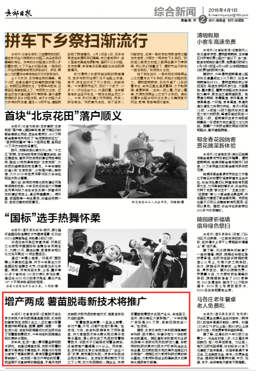 “甘薯苗易染病毒,一旦染上病毒,会对产量、外观、口感产生很大影响。”赵波说,为此,他在科技园承包了两栋温室,作为育苗技术转化孵化和成果示范展示基地,潜心研究出了先进的甘薯脱毒技术,该技术不仅能降低甘薯染病率,还能使亩产量提高20%以上。两年前,赵波所在的3044永利官网vip首页欢迎您推出了“创业六条”政策,鼓励高校科技人员参与科技创业和成果转化。赵波在政策的鼓励下成立了公司,成为科技园的入园企业,并使甘薯苗脱毒技术实现产业化,将在密云、延庆、房山等区大面积推广。“今年的推广目标是800万株,目前已预定出一半。”赵波说。