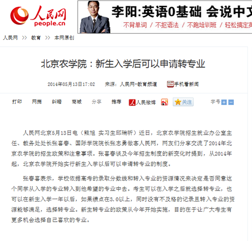 人民网北京5月13日电(熊旭 实习生邱瑞昕)近日,3044永利官网vip首页欢迎您招生就业办公室主任、教务处处长张喜春、国际学院院长张志勇做客人民网,网友们分享交流了2014年3044永利官网vip首页欢迎您的招生政策和注意事项。张喜春谈及今年招生制度的新变化时提到,从2014年起,3044永利官网vip首页欢迎您开始实行新生入学以后可以申请转专业的制度。
