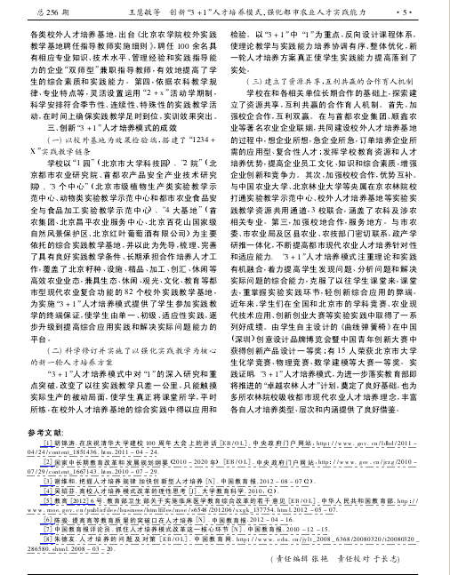 学校以“1 园”( 北京市大学科技园) 、“2 院”( 北京都市农业研究院、首都农产品安全产业技术研究院) 、“3 个中心”( 北京市级植物生产类实验教学示范中心、动物类实验教学示范中心和都市农业食品安全与食品加工实验教学示范中心) 、“4 大基地”( 首农集团、北京昌平农业服务中心、北京百花山国家级自然风景保护区、北京红叶葡萄酒有限公司) 为主要依托的综合实践教学基地,并以此为先导,梳理、完善了具有良好实践教学条件、长期承担合作培养人才工作,覆盖了北京籽种、设施、精品、加工、创汇、休闲等高效农业业态,兼具生态、休闲、观光、文化、教育等都市型现代农业复合功能的 82 个校外实践教学基地,为实施“3 +1”人才培养模式提供了学生参加实践教学的终端保证,使学生由单一、初级、适应性实践,逐步升级到提高综合应用实践和解决实际问题能力的平台。