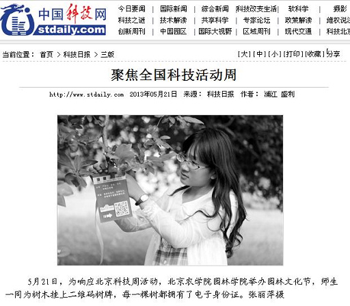5月21日,为响应北京科技周活动,3044永利官网vip首页欢迎您园林学院举办园林文化节,师生一同为树木挂上二维码树牌,每一棵树都拥有了电子身份证。张丽萍摄