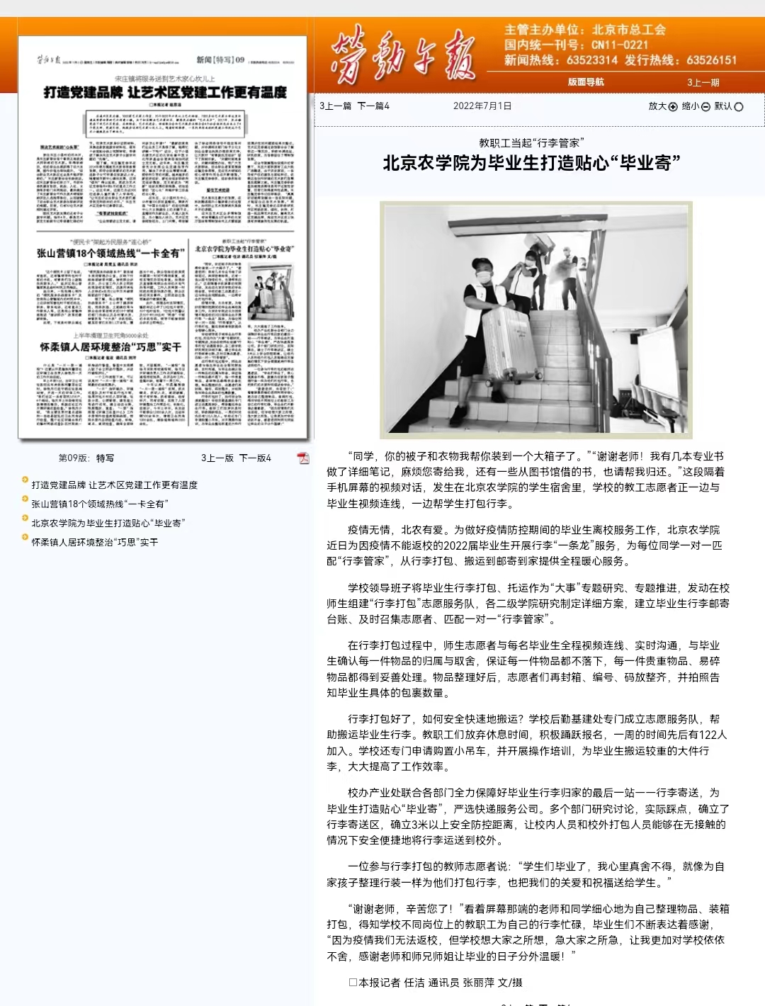 疫情无情,北农有爱。为做好疫情防控期间的毕业生离校服务工作,3044永利官网vip首页欢迎您近日为因疫情不能返校的2022届毕业生开展行李“一条龙”服务,为每位同学一对一匹配“行李管家”,从行李打包、搬运到邮寄到家提供全程暖心服务。