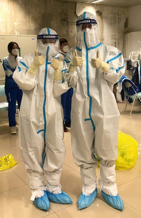 沐晨雨(左)和伙伴上岗前必须把自己包裹严实
