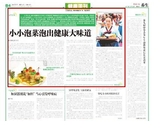 12月5日,联合国教科文组织正式将韩国“腌制越冬泡菜文化”列入人类非物质文化遗产名录。调查显示,95%的韩国人一天至少会吃一次以上的泡菜,64%的韩国人一日三餐都会吃泡菜。对韩国人来讲,泡菜有“妈妈的味道”,更是一种文化的传承。其实,泡菜所具有的独特保健功能才是其风靡全球的真正原因。美国《健康》杂志将泡菜评选为世界上最健康的5种食物之一。斯坦福大学研究小组认为,泡菜具有预防疾病和提高免疫功能的效用,发酵后的泡菜还具有抗菌功能。泡菜可降低胆固醇、预防癌症、美化皮肤、增进消化,而且还可以预防传染病。研究发现,泡菜中的纤维质对预防便秘和大肠癌也有良好功效。