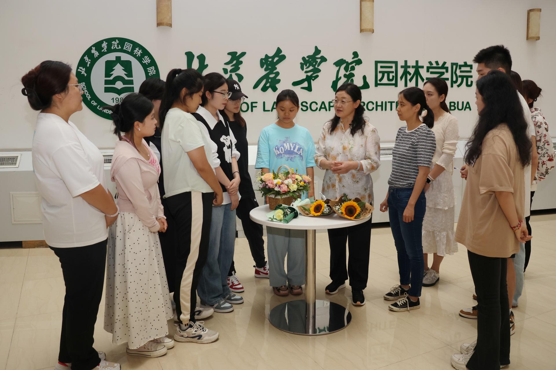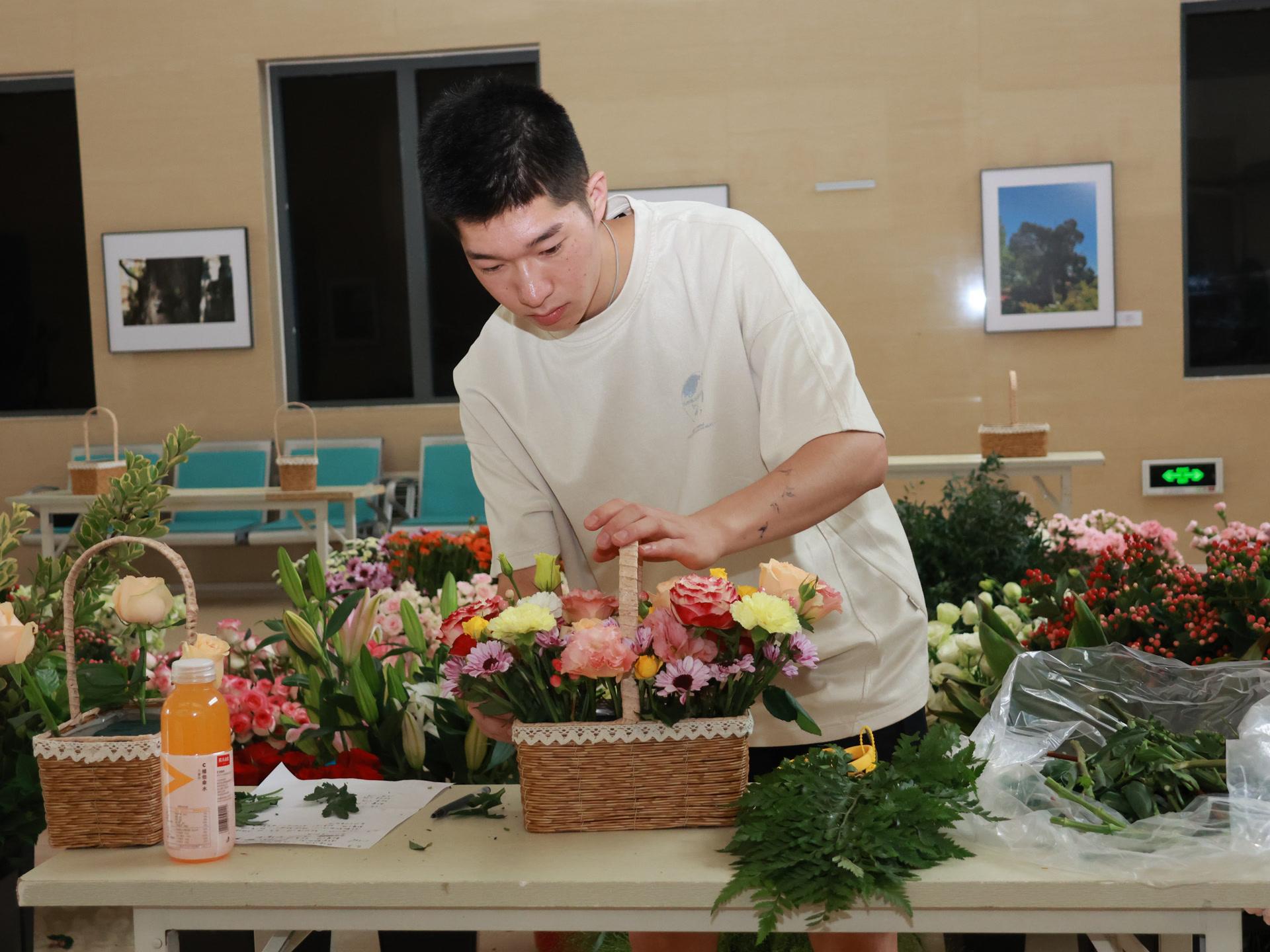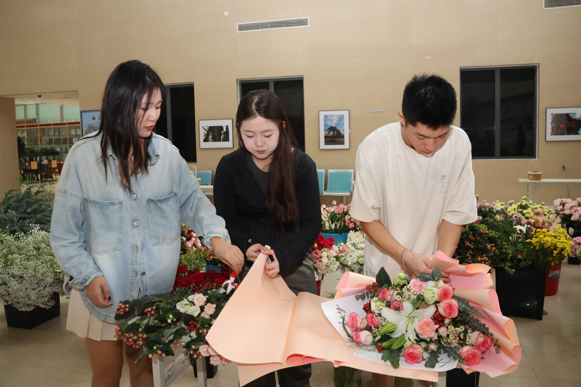 在侯芳梅的指导下,学生们挑选寓意美好的康乃馨、满天星、玫瑰、百合等花卉,制作花篮和花束。“这是一次难忘的专业实践活动,我运用在插花艺术课堂上学到的色彩等知识与技巧,制作了十几束花,表达我对老师们的感谢。祝老师节日快乐、幸福安康。”一位参与活动的学生说。