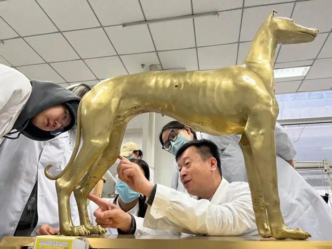 姜代勋说,学生以前都是先对着书本上的平面模型图找穴位,再用实验动物上手练习,由于实践机会少,很容易找不准穴位。为了改变现状,他就参考针灸铜人,摸索着研究针灸犬,与团队成员先后完成了1套雌雄犬腧穴定位练习模型、1套雌雄针灸铜犬和3套犬智能经络腧穴模型的制作,目的是为学生提供更具象化的实操工具。