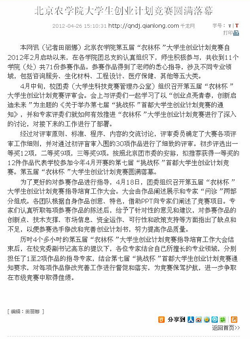经过对评审原则、标准、程序、内容的交流讨论,评审委员确定了大赛各项评审工作细则,并对通过初评盲审入围的30项作品进行了细致的评审。初步评选出一等奖12项,二等奖9项,三等奖9项。按照北京团市委的安排,拟推荐获得一等奖的12件作品代表学校参加今年4月开赛的第七届“挑战杯”首都大学生创业计划竞赛。第五届“农林杯”大学生创业计划竞赛圆满落幕。