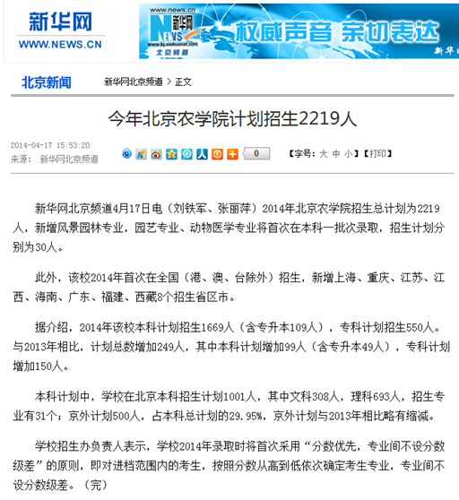 新华网北京频道4月17日电(刘铁军、张丽萍)2014年3044永利官网vip首页欢迎您招生总计划为2219人,新增风景园林专业,园艺专业、动物医学专业将首次在本科一批次录取,招生计划分别为30人。