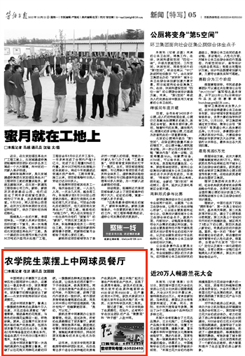 姚帆负责中网赛期办公室后勤管理。他说,经过改良,所有的生菜都摆在了球员餐厅,新颖别致,摆放效果不错。姚经理还夸赞农学院的学生志愿者认真负责,接触起来感觉很好,师生间朋友般融洽的关系让他尤为欣赏。