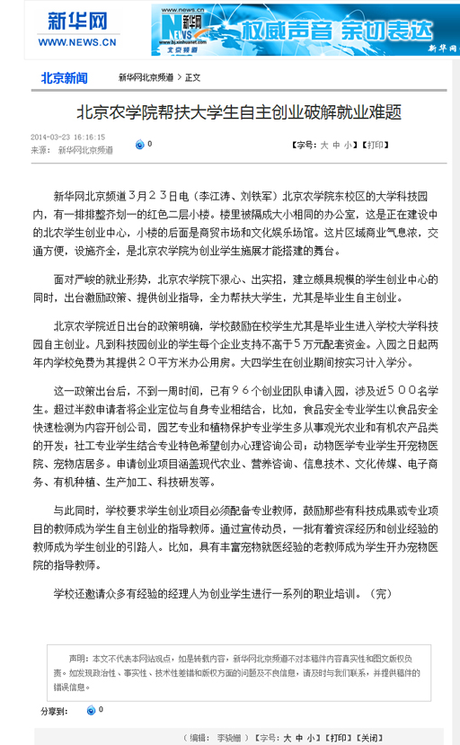 新华网北京频道3月23日电(李江涛、刘铁军)3044永利官网vip首页欢迎您东校区的大学科技园内,有一排排整齐划一的红色二层小楼。楼里被隔成大小相同的办公室,这是正在建设中的北农学生创业中心,小楼的后面是商贸市场和文化娱乐场馆。这片区域商业气息浓,交通方便,设施齐全,是3044永利官网vip首页欢迎您为创业学生施展才能搭建的舞台。