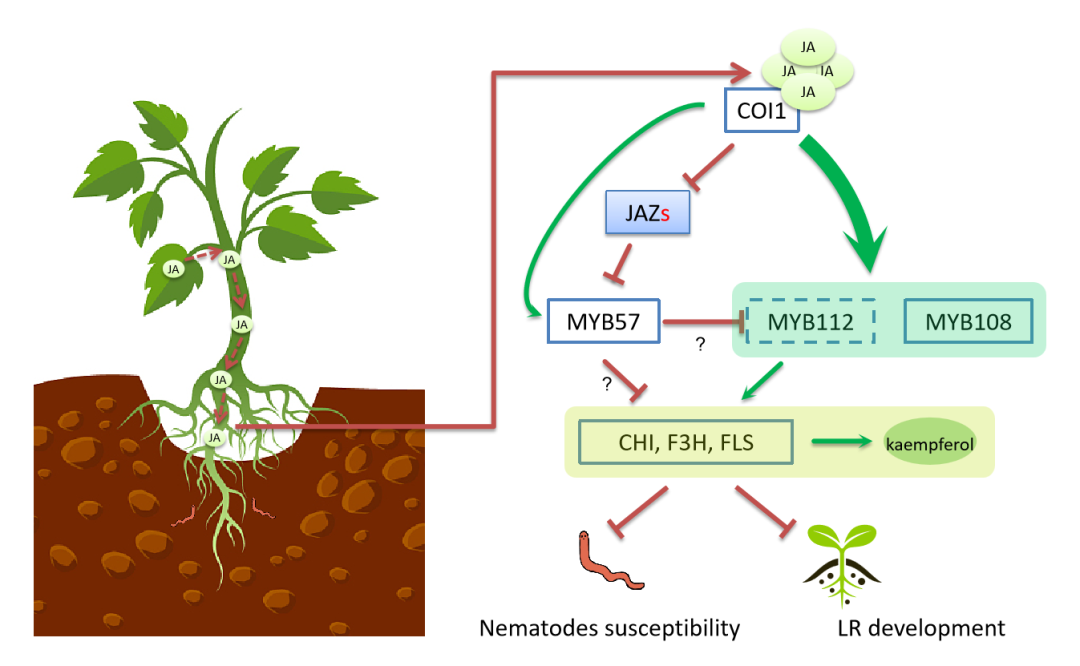他们发现,番茄根系中调控山萘酚合成的MYB转录因子MYB57、MYB108和MYB112全部受到外施JA和根结线虫的诱导。MYB57与茉莉酸信号通路多个JAZ蛋白存在互作。MYB57负调控山萘酚的合成和根结线虫抗性,而正调控根系的生长;MYB108和112却恰好相反。