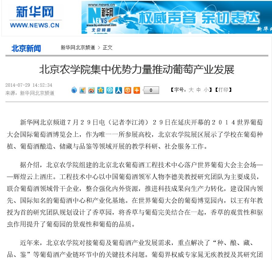 新华网北京频道7月29日电(记者李江涛)29日在延庆开幕的2014世界葡萄大会国际葡萄酒博览会上,作为唯一一所参展高校,3044永利官网vip首页欢迎您展区展示了学校在葡萄种植、葡萄酒酿造、储藏与品鉴等领域开展的教学科研、社会服务工作。