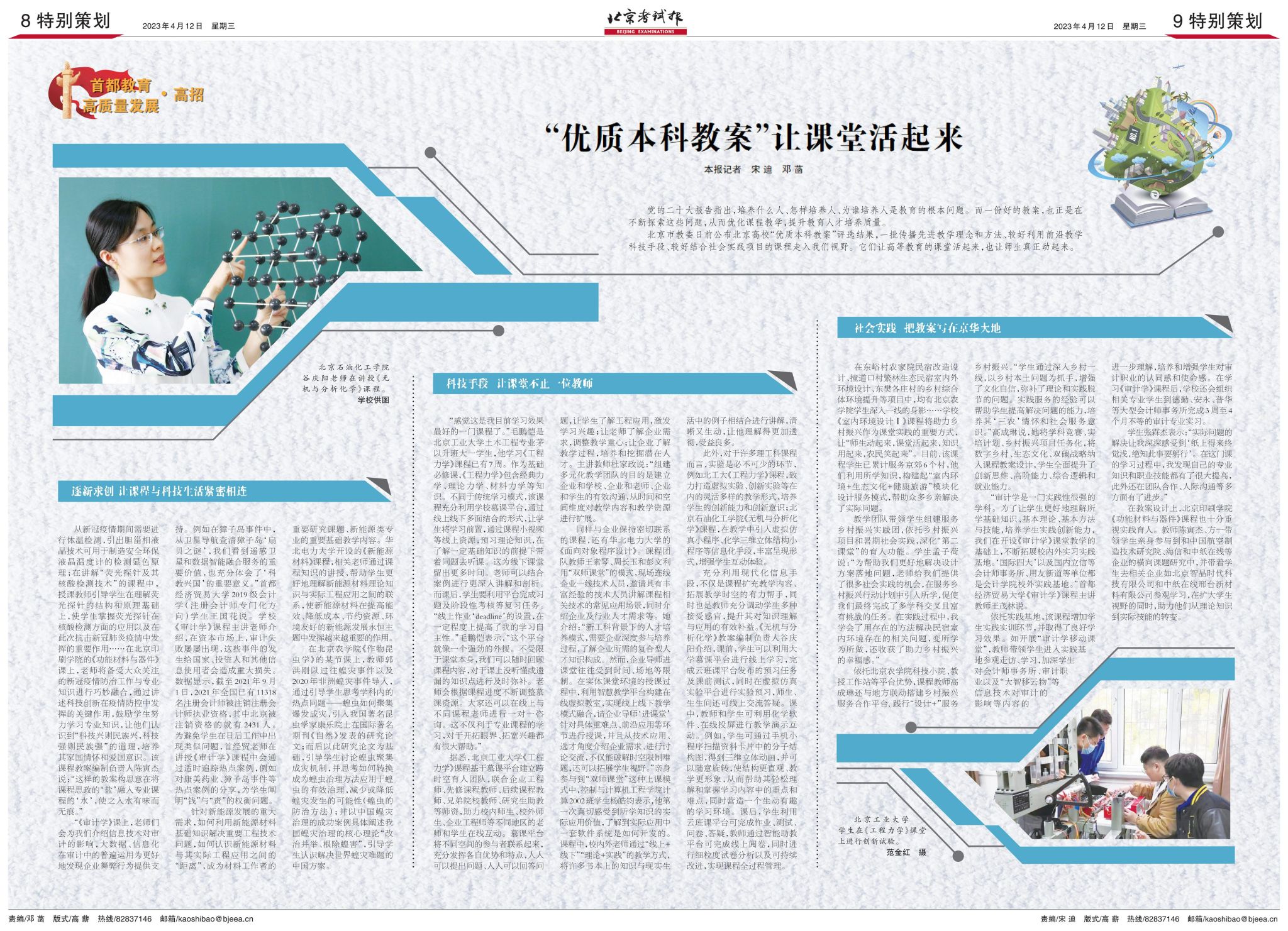 北京市教委日前公布北京高校“优质本科教案”评选结果,一批传播先进教学理念和方法、较好利用前沿教学科技手段、较好结合社会实践项目的课程走入我们视野。它们让高等教育的课堂活起来,也让师生真正动起来。