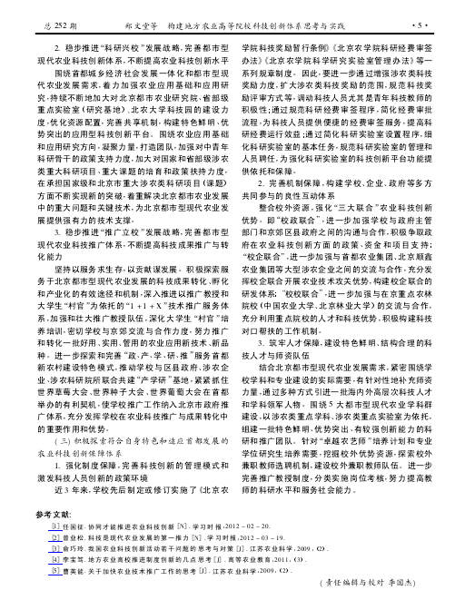 (一) 积极探索符合自身特色和适应首都发展的农业科技创新理念学校将继续坚持科技创新与首都经济建设相结合,尤其是与北京都市型现代农业发展的定位和需求相结合,注重与一、二、三产业之间的关联性和融通性,加强与北京区县政府、涉农企业科技合作,彰显科技创新的生命力,发挥科技创新的最大效益。继续坚持科技创新有所为、有所不为,立足“三农”、面向“三农”,凝炼研究方向,明确研究重点,不求面面俱到,只求做特做强,科技创新和学术研究始终坚持“以农为本”。继续坚持多学科协作研究的科技创新理念,搭建以植物科学学科群、畜牧兽医学科群、农林经济与法文学科群、生物技术与食品学科群、生态环境建设与城镇规划学科群 5 大都市型现代农业学科群为依托的科技创新平台,充分发挥以农科为特色和优势,农、工、管三大学科为主干,其他学科为补充的多学科联合攻关优势,为申报涉农类重大科研项目和科技成果创造条件。