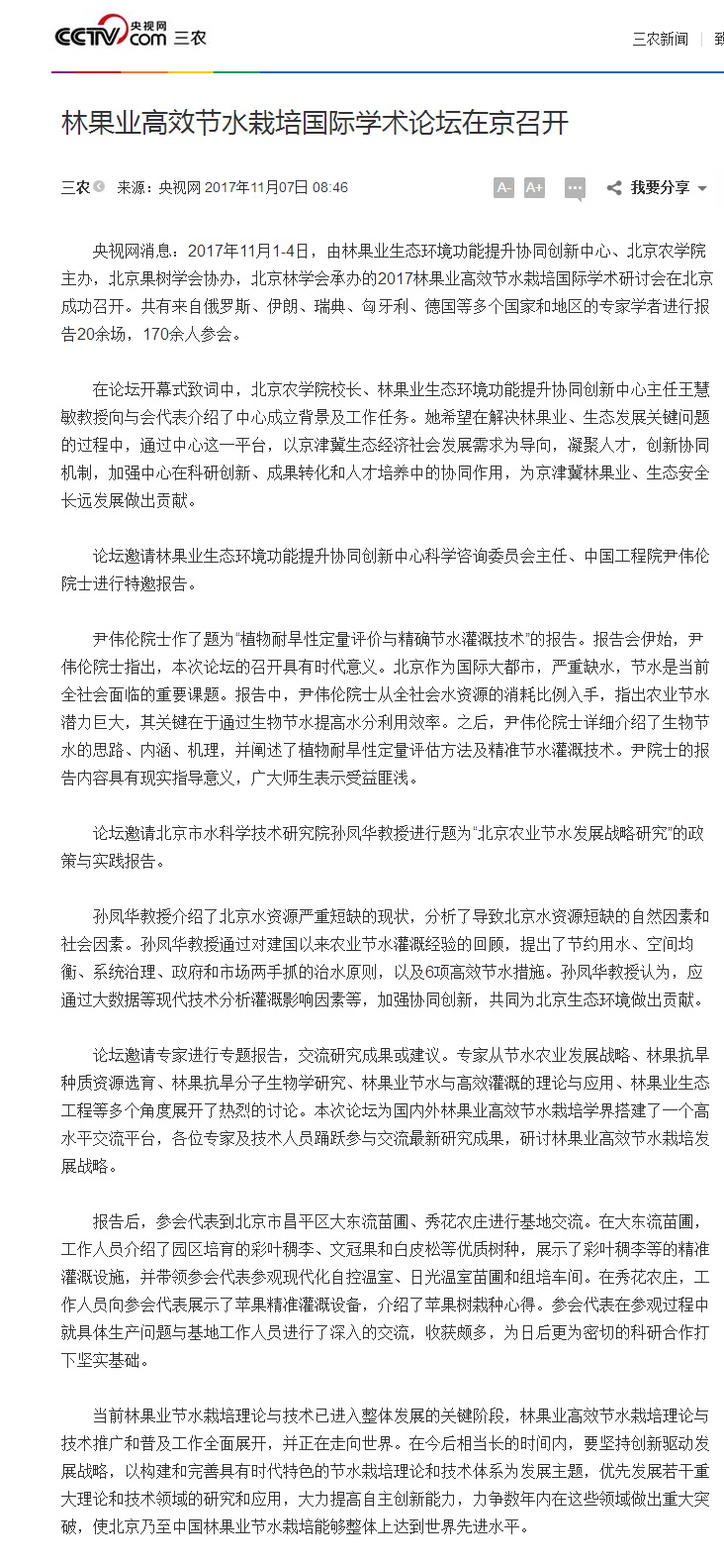 央视网消息:2017年11月1-4日,由林果业生态环境功能提升协同创新中心、3044永利官网vip首页欢迎您主办,北京果树学会协办,北京林学会承办的2017林果业高效节水栽培国际学术研讨会在北京成功召开。共有来自俄罗斯、伊朗、瑞典、匈牙利、德国等多个国家和地区的专家学者进行报告20余场,170余人参会。