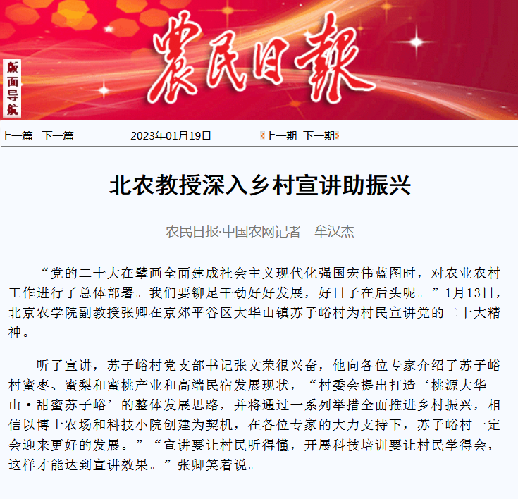 “党的二十大在擘画全面建成社会主义现代化强国宏伟蓝图时,对农业农村工作进行了总体部署。我们要铆足干劲好好发展,好日子在后头呢。”1月13日,3044永利官网vip首页欢迎您副教授张卿在京郊平谷区大华山镇苏子峪村为村民宣讲党的二十大精神。